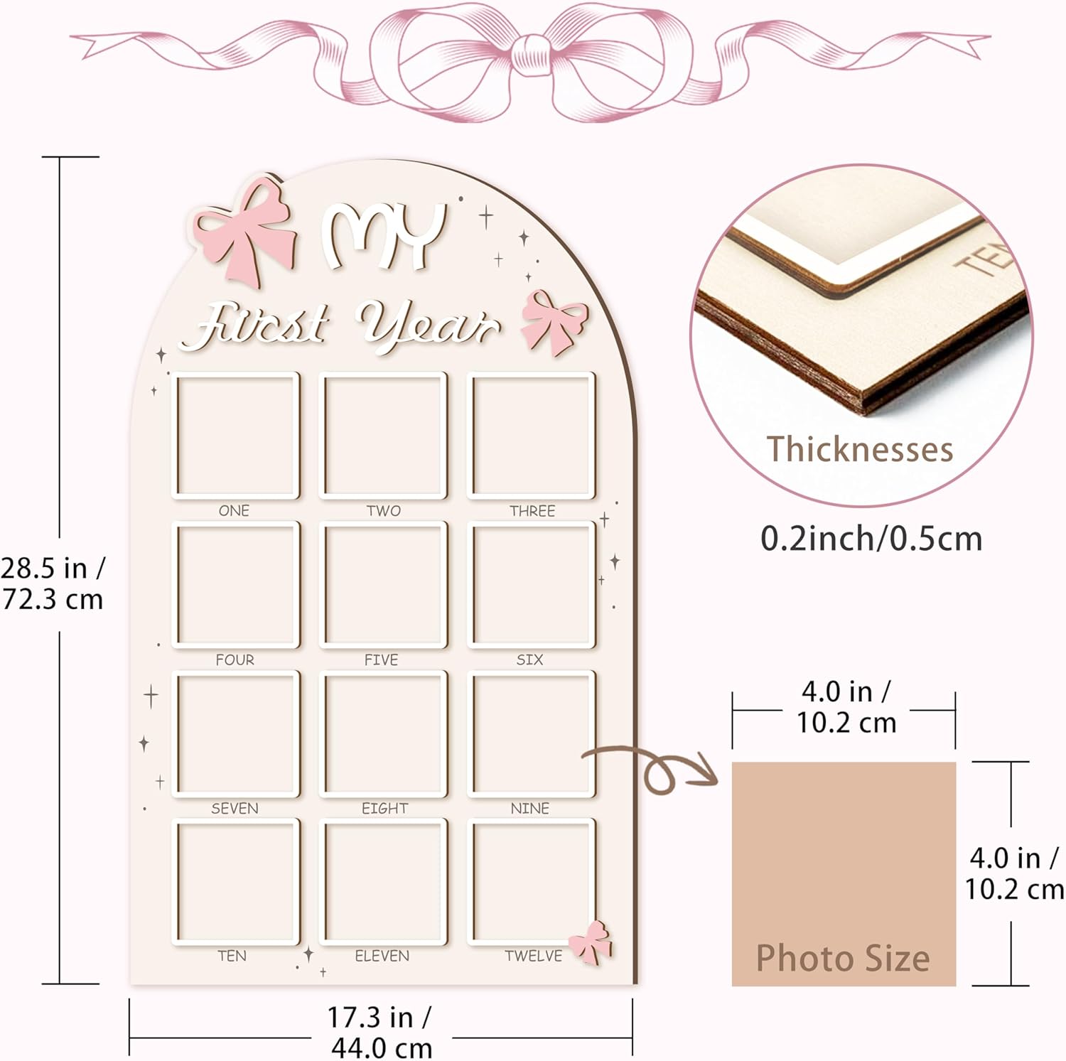 Bow One Year of Photo Board, My First Year Photo Photo Board 12 Monthly Milestones Picture Frame for Baby Girl 1st Birthday Decorations